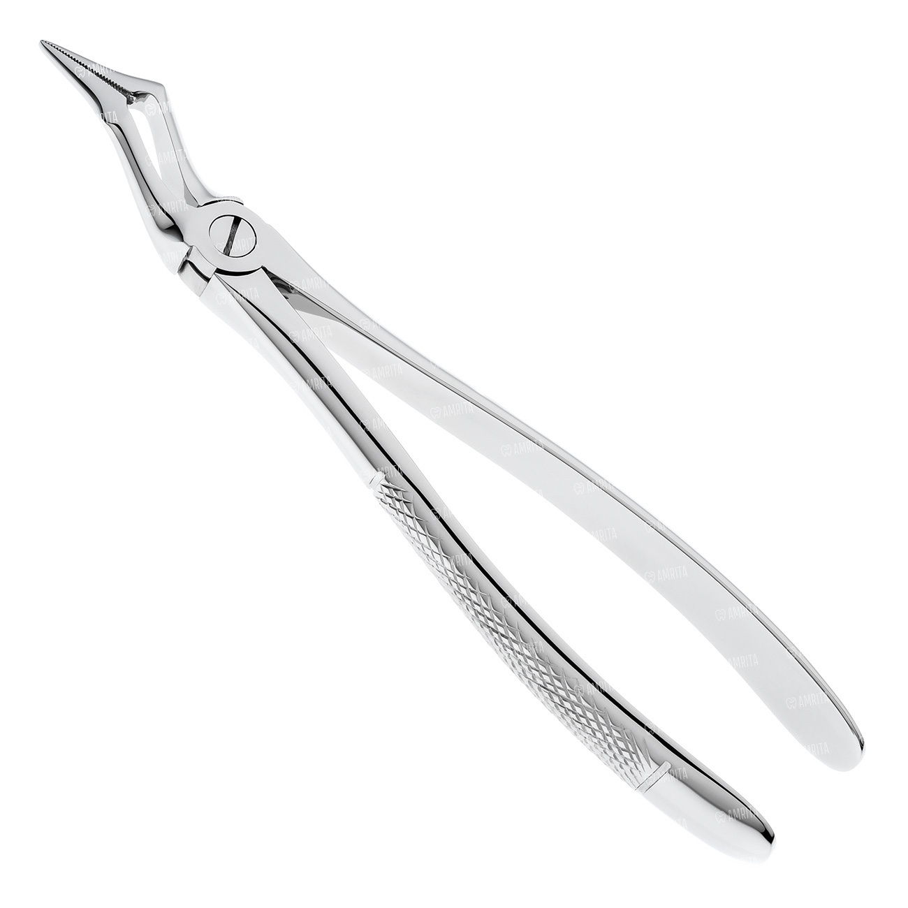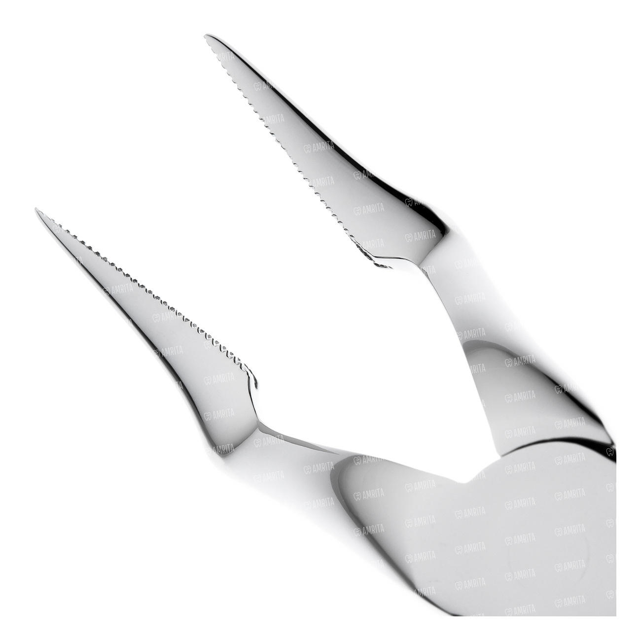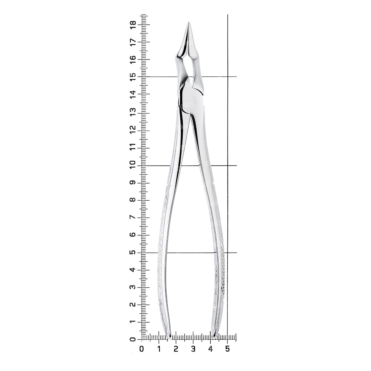 Щипцы для удаления корней на верхней челюсти узкие удлиненные. Форма №152. Бранши полностью сходящиеся удлиненные. Рабочая часть имеет штыковидный (байонетный) изгиб. Внутренняя поверхность рабочей части имеет поперечно-продольные насечки.