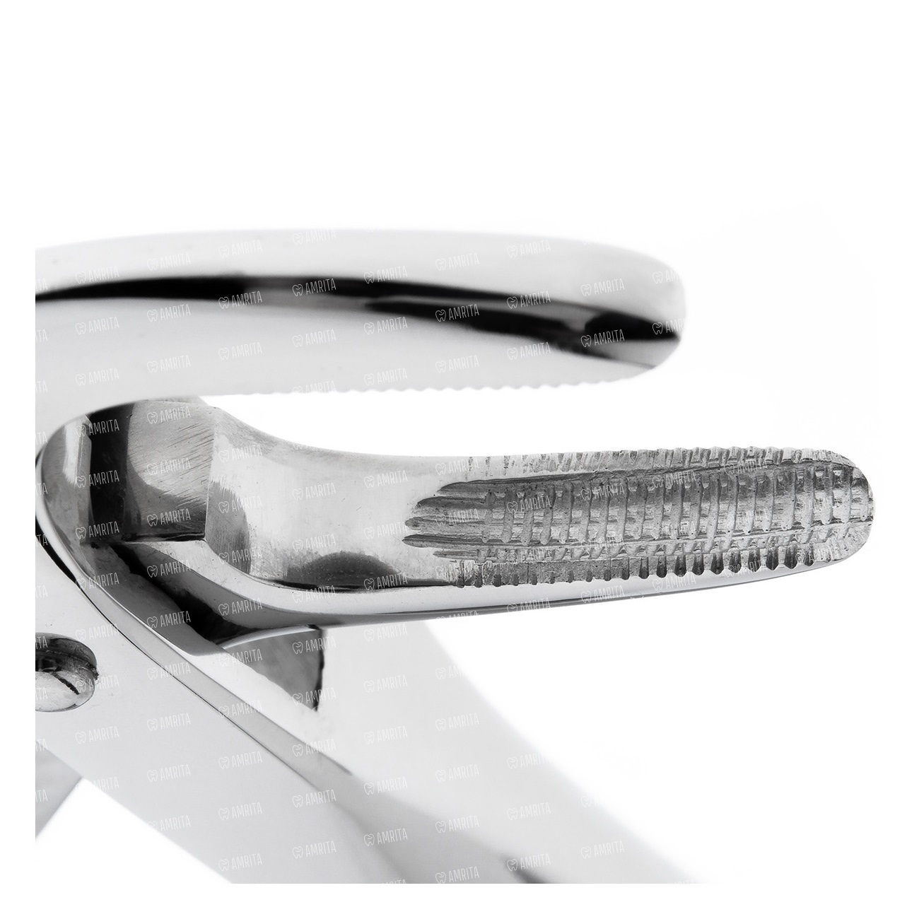Внутренняя поверхность рабочей части имеет поперечно-продольные насечки. Наружная поверхность ручек покрыта ретенционным узором предотвращающим скольжение фаланг пальцев в латексной перчатке. Одна из половин инструмента имеет продольную прорезь в области шарнира и пропускает через себя вторую половину щипцов. Отполированы до зеркального блеска.