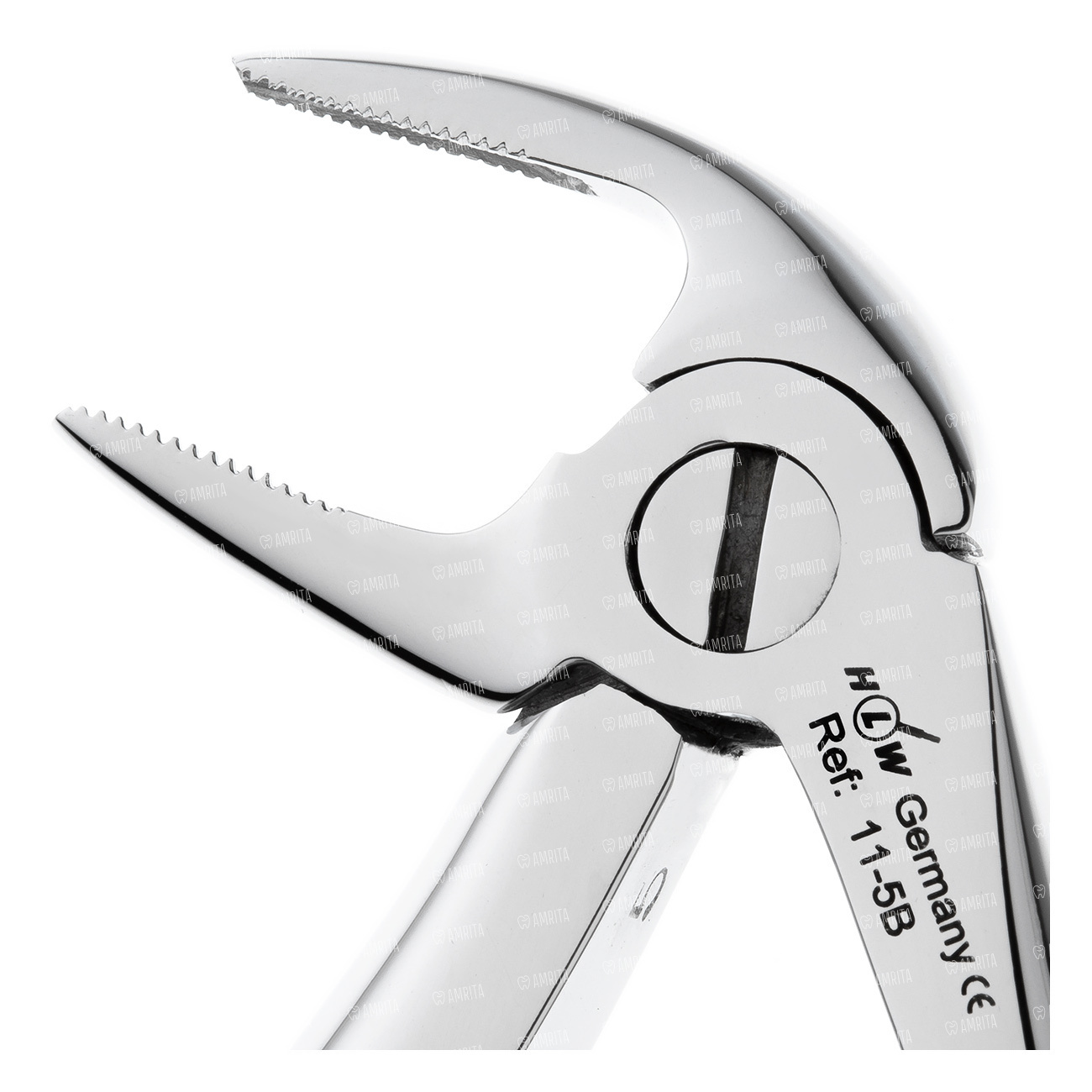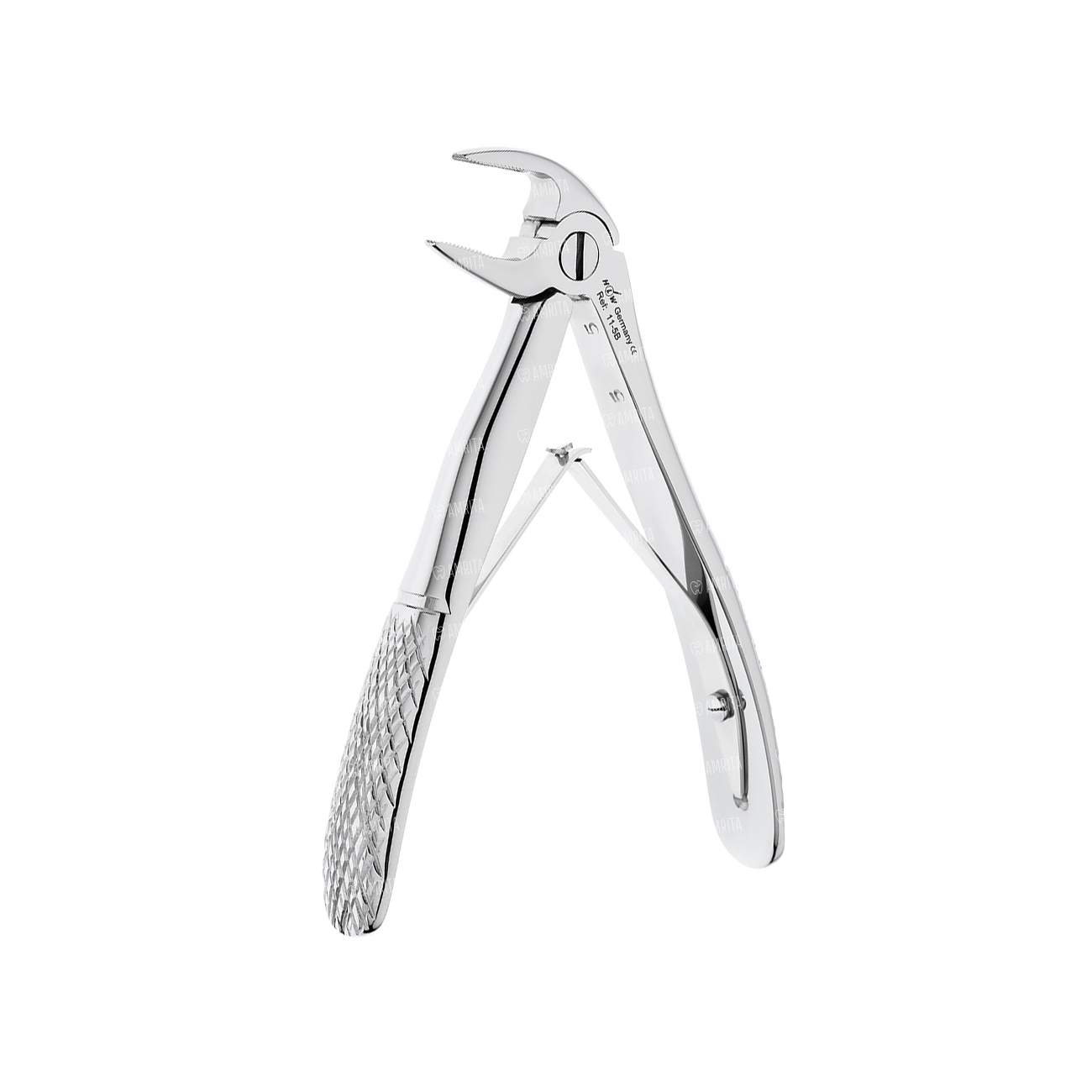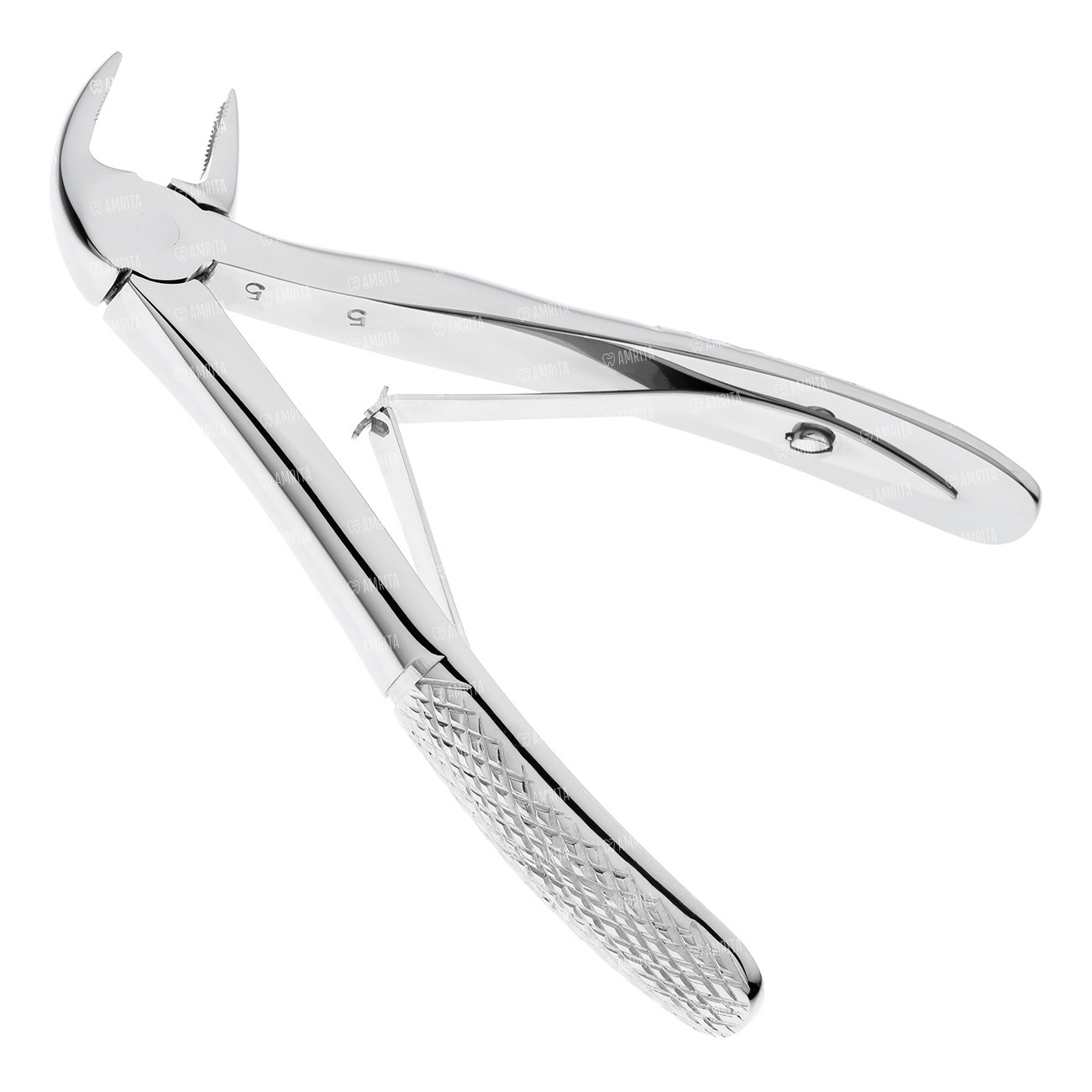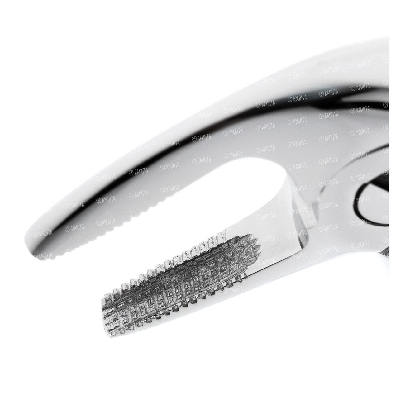 Щипцы для удаления молочных резцов нижней челюсти. Имеют укороченные бранши малой толщины с микроретенционными насечками на внутренней поверхности, улучшающими захват фрагмента корня в лунках альвеол с овальным поперечным сечением. Бранши изогнуты по ребру, кончики плотно контактируют.