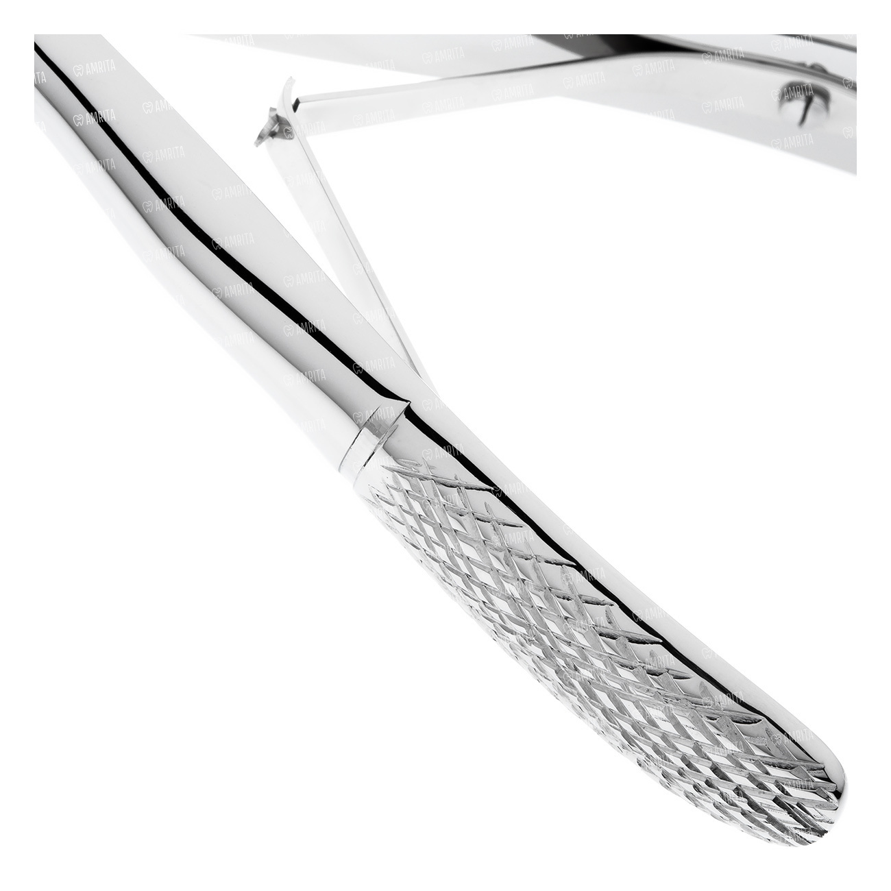 На внутренней поверхности меют слабовыраженную вогнутость. Так же до шарнирного соединения имеется укороченнаячасть браншей позволяющая удобно применять данные щипцы на боковых участках зубного ряда верхней челюсти у дечей со сменным прикусом. Наружняя поверхность ручек имеет эргономически удобные анатомичные изгибы для фаланг пальцев, на внутренней стороне каждой закреплена пружина раскрывающая бранши инструмента.