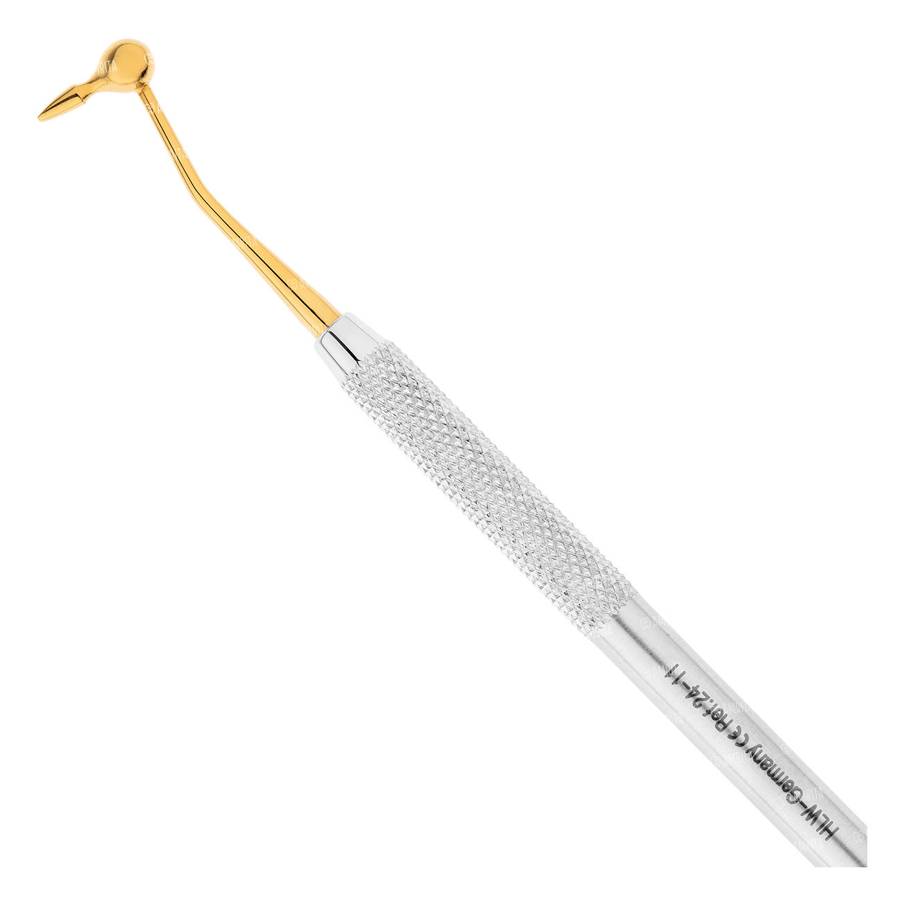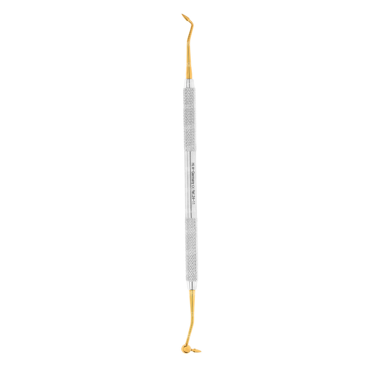 Рабочая часть одной из сторон отклонена на 45 градусов относительно продольной оси инструмента и позиционированы на промежуточной части с двойным разнонаправленным изгибом и нитрид-титановым покрытием. Представляет собой небольшую гладилку конической формы, предназначенную для формирования анатомических структур зуба с одновременной латеральной конденсацией и полировкой твердеющих цементов или амальгамы. Вторая рабочая часть позиционирована аналогично, однако под углом приближающимся к 60 градусам. Форма образована за счет комбинации овоидного штопфера и конической гладилки, соединенных со стороны меньшего диаметра штопфера.