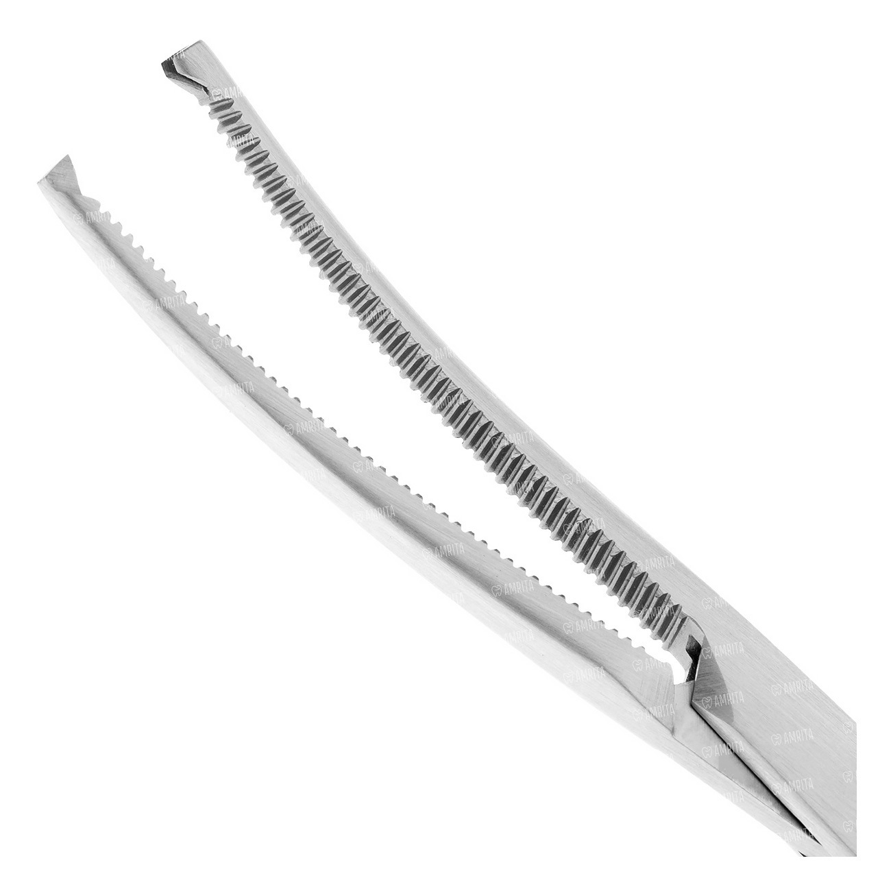 Зажим Кохера изогнутый по плоскости. Рабочие части на внутренней поверхности покрыты мелким поперечными во всю ширину зубцами, на конце на одной из рабочих частей продольно расположенный крупный зубец, соответствующий выемке между двумя аналогично расположенными зубцами на противоположенной рабочей части.