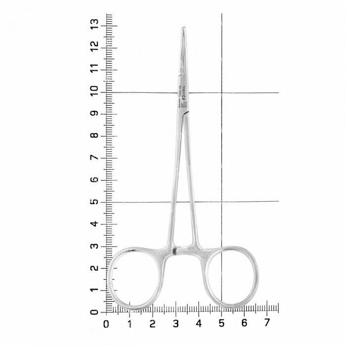Кремальера, расположенная вблизи колец, обеспечивает удержание зажима в замкнутом положении, а также контролирует силу сдавливания.