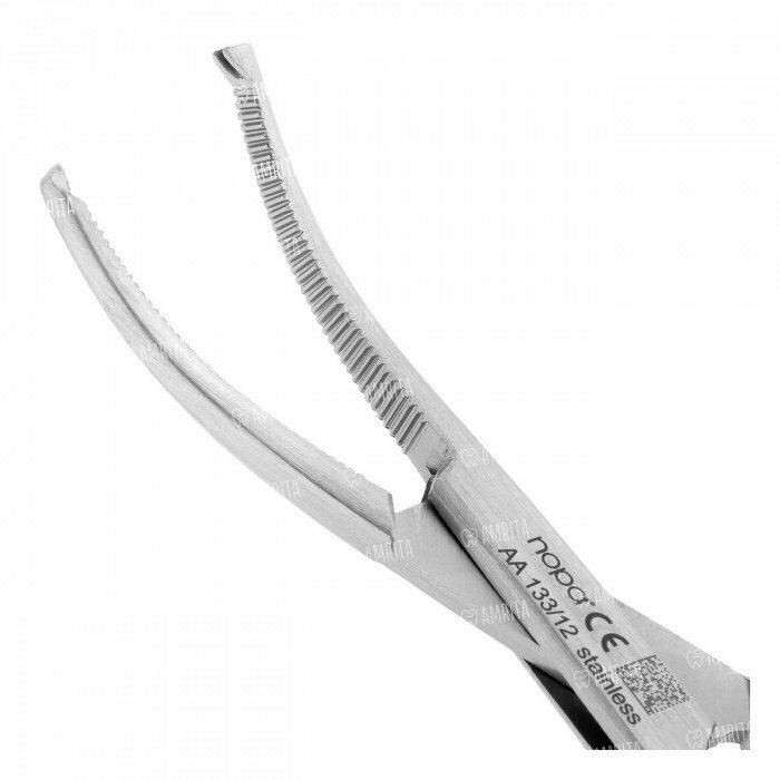 Изгиб по плоскости в рабочей части зажима способствует проведению манипуляции в глубоких и труднодоступных участках полости рта. Поперечный ретенционный узор на внутренних поверхностях щечек инструмента позволяет надежно удерживать ткани во время процедур по остановке кровотечения.