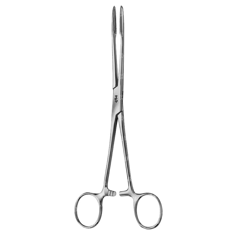 Корнцанг по GROSS, прямой, длина 200 мм, BF046R, B.Braun (Aesculap, Германия) оснащен фиксирующим элементов кремальерой со ступенчатой конструкцией. Он предназначен для использования в операционных/перевязочных для захватывания стерильных инструментов и перевязочного материала нестерильными руками. Кроме этого, корнцанги также используются в ходе хирургической операции, при необходимости проникновения через ткани тупо.