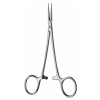 Кровоостанавливающий зажим с изогнутой рабочей частью. На щечках есть насечки, которые обеспечивают надежный захват.