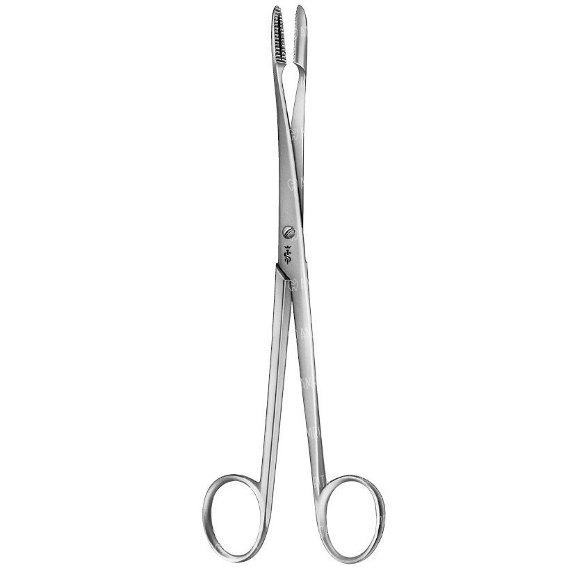 Корнцанг по GROSS, изогнутый, длина 200 мм, BF041R, B.Braun (Aesculap, Германия) оснащен фиксирующим элементов кремальерой со ступенчатой конструкцией. Он предназначен для использования в операционных/перевязочных для захватывания стерильных инструментов и перевязочного материала нестерильными руками. Кроме этого, корнцанги также используются в ходе хирургической операции, при необходимости проникновения через ткани тупо.