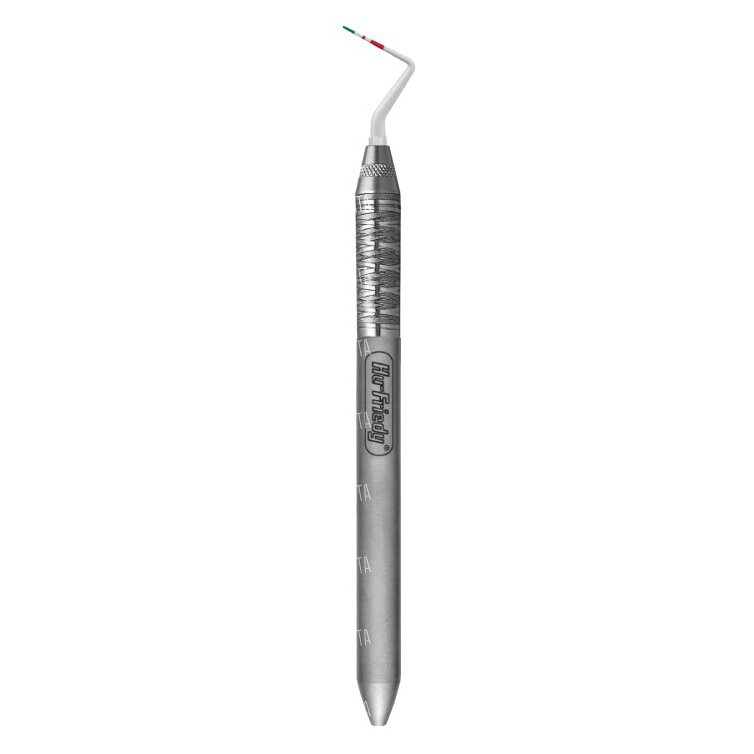 Пластик предотвращает повреждение искусственных коронок и имплантов. Изогнутые тонкие насадки легко проникают в узкие пародонтальные карманы. Маркировка насадок в 3-5-7 и 10 мм позволяет определить глубину кармана наиболее точно.