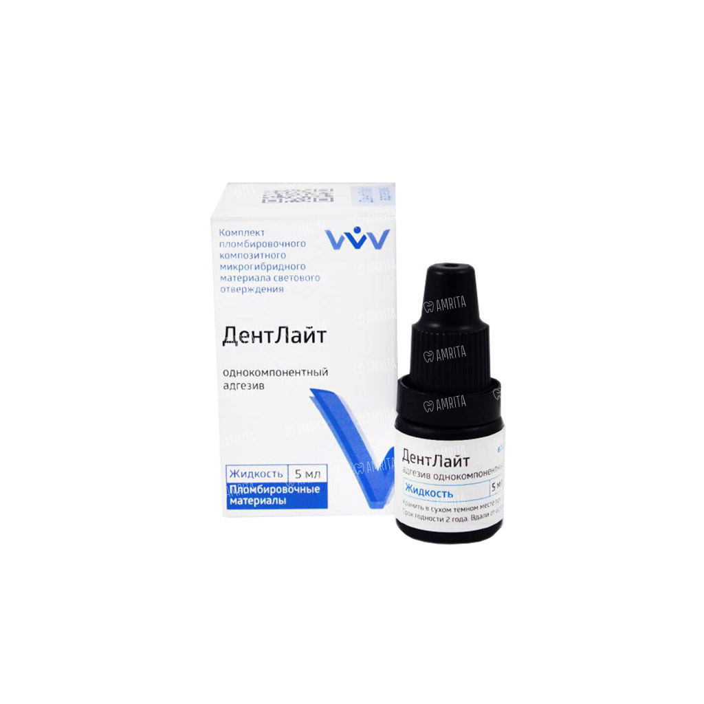 Однокомпонентный светоотверждаемый адгезив «ДентЛайт» содержит метакрилатные олигомеры (HEMA, PMDM, UDMA), нанонаполнитель, активаторы полимеризации, стабилизаторы, растворители.