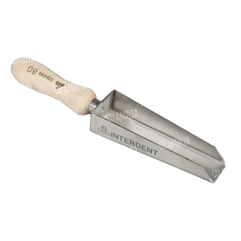 Лопатка Interdent имеет анатомическую ручку, изготовленную из светлого дерева. Инструмент используется в работе со стоматологическим сплавом.
