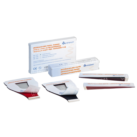 Артикуляционная бумага в виде подковы применяется для определения окклюзионных и артикуляционных отклонений в естественном прикусе и протезах в зубоврачебном кабинете или в зуботехнической лаборатории.