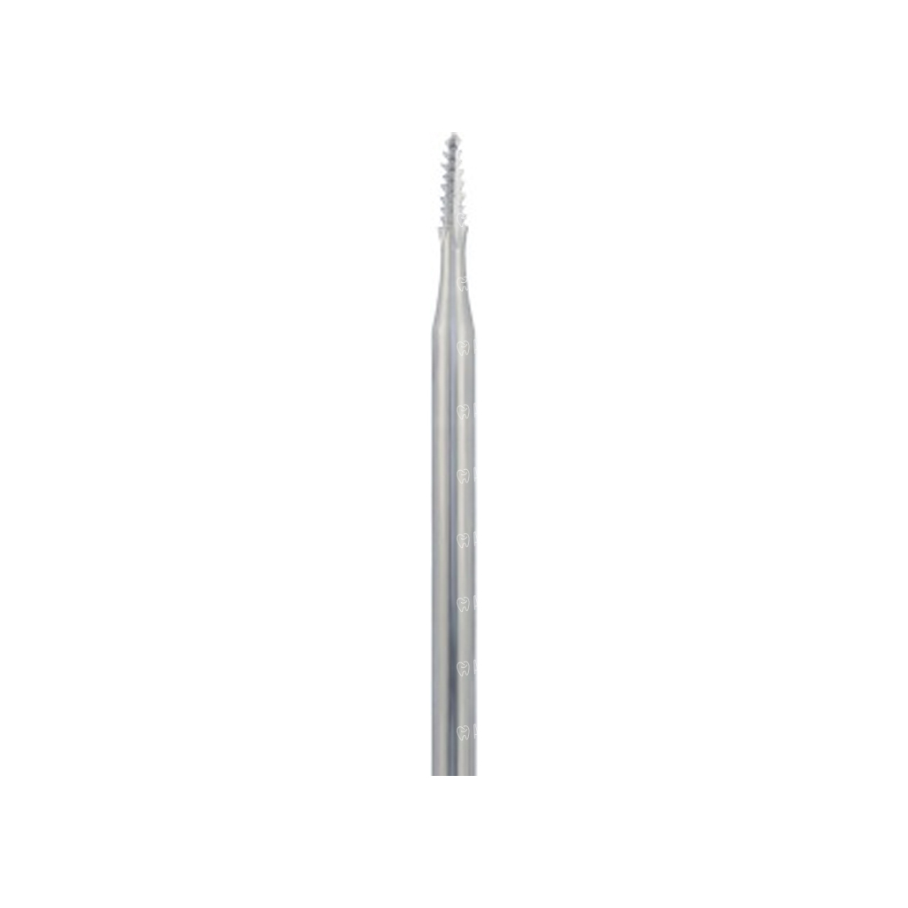 Твердосплавный хирургический бор Линдемана для разрезания кости. На гранях бора есть насечки для более точной и эффективной работы по твердым тканям.
