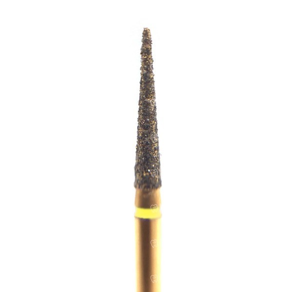 Многослойный алмазный бор G858, игловидный/пика, под турбинный наконечник. В основном используется для финишной обработки прямых и непрямых реставраций в придесневом и проксимальных участках. Также может применяться для финишной обработки стенок кариозной полости или сепарации зубов на начальных этапах препарирования под коронки.