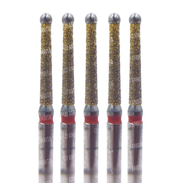 Бор алмазный 388Q, GOLD Line, шаровидный с воротником, безопасный конец, D=1.4 мм, FG, красный, 5 шт