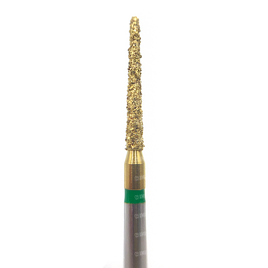 Алмазный бор TIN T 850 под турбинный наконечник от D+Z используется для препарирования под коронку. Пиковидная узкая рабочая часть эффективно справляется с тонкими слоями твердых тканей, помогает полировать поверхности культи зуба. Золотистое покрытие и цветовая маркировка на хвостовике помогают идентифицировать инструмент максимально быстро.