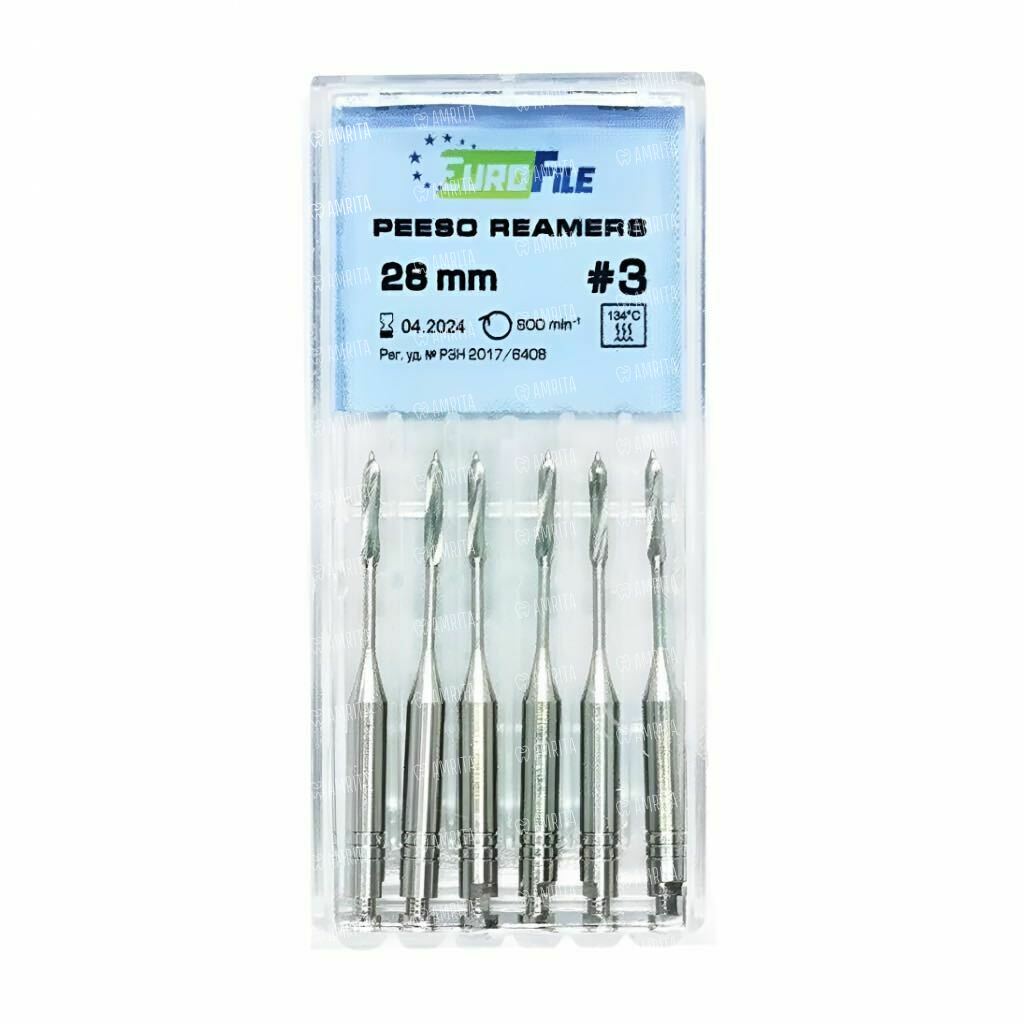 Дрильборы машинные Eurofile Peeso Reamer, для работы с каналом после вскрытия полости, 28 мм, размер 3, сталь, 6 шт