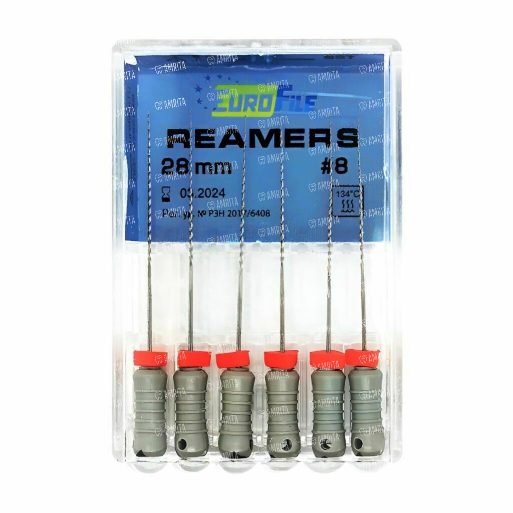 Дрильборы ручные Eurofile Reamers, для прохождения и расширения корневых каналов, 28 мм, №08, сталь, 6 шт