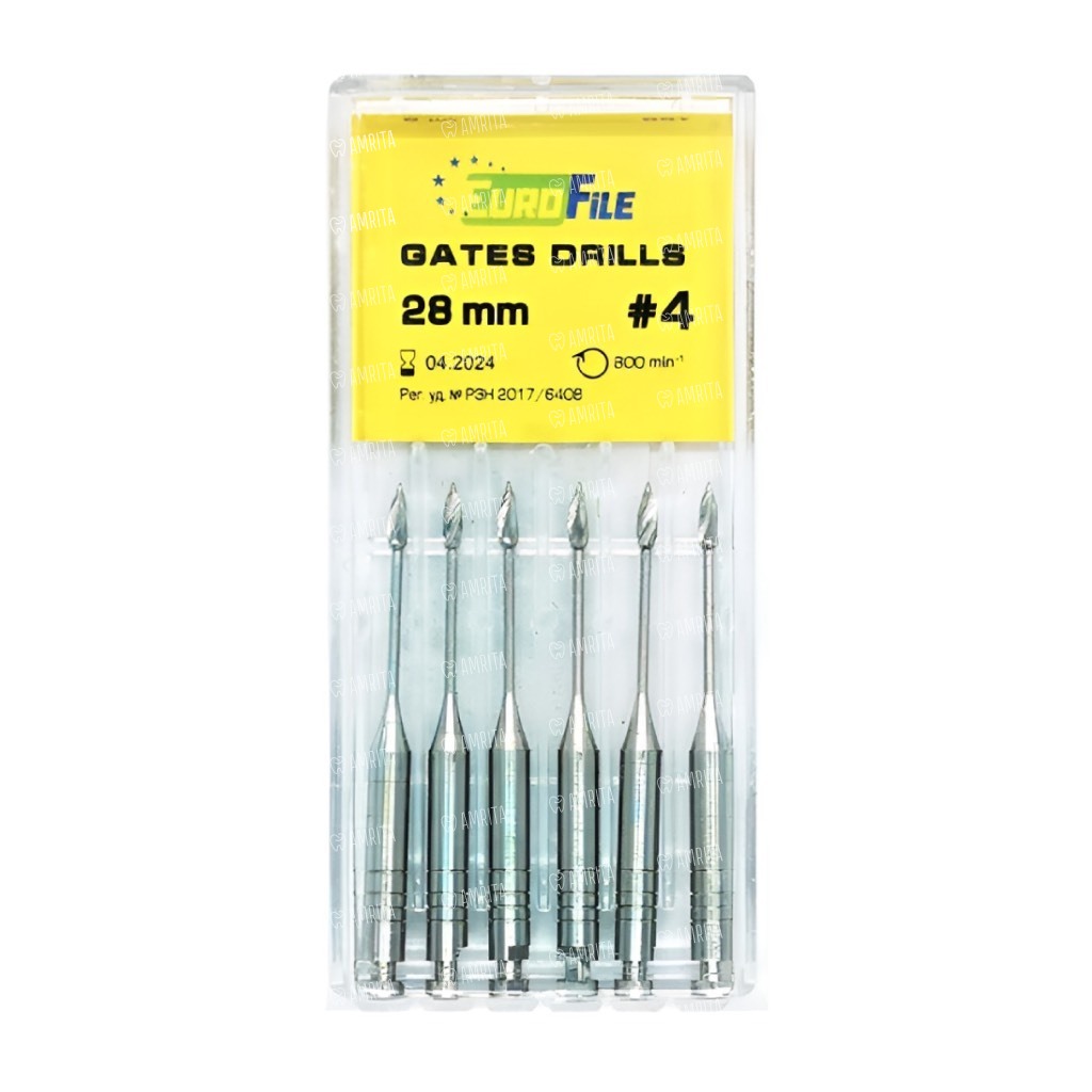 Дрильборы машинные Eurofile Gates Drills, для расширения коронковой трети канала, 28 мм, размер 4, сталь, 6 шт