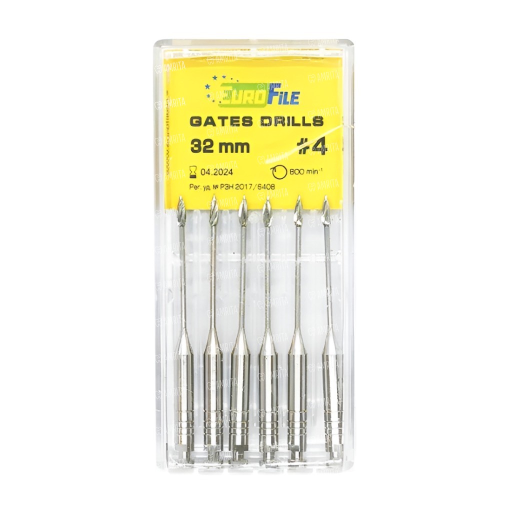Дрильборы машинные Eurofile Gates Drills, для расширения коронковой трети канала, 32 мм, размер 4, сталь, 6 шт