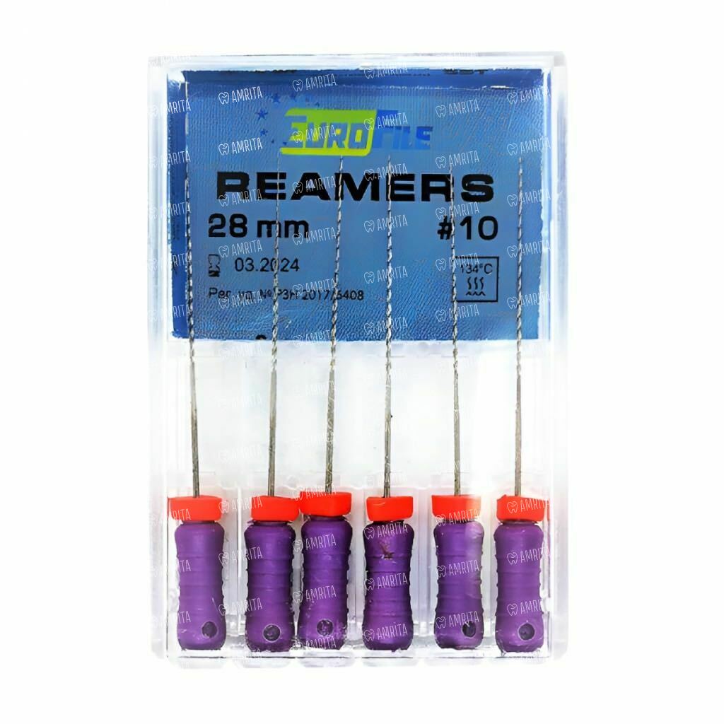 Дрильборы ручные Eurofile Reamers, для прохождения и расширения корневых каналов, 28 мм, №10, сталь, 6 шт
