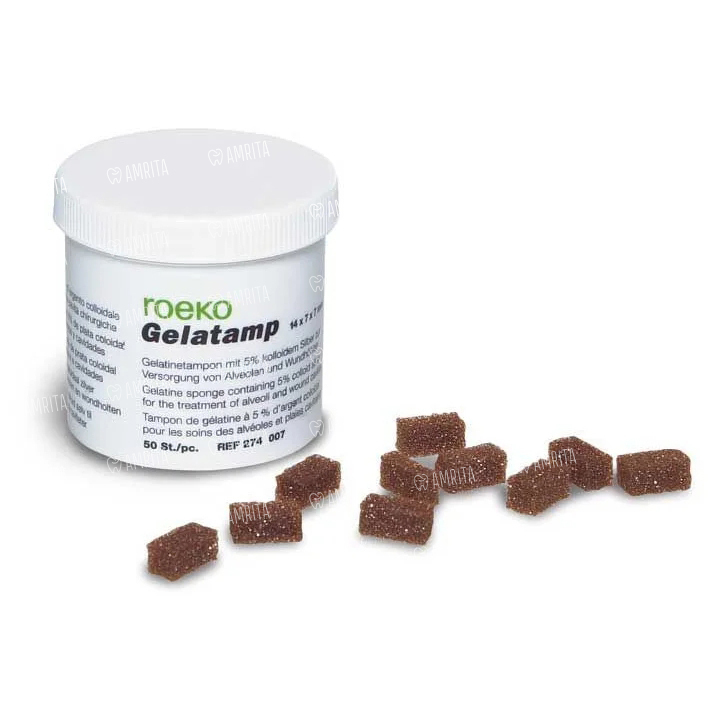 Gelatamp - желатиновая губка с содержанием коллоидного серебра. Предназначена для тампонирования лунки после хирургического вмешательства, например, после удаления (экстирпация) зуба, и может быть подрезана до размеров раневой поверхности. Благодаря равномерно пористой структуре Gelatamp может впитывать в несколько раз больше крови, чем весит сам. Он способствует коагуляции крови и организации кровяного сгустка, надежно тампонирующего рану. Это предотвращает возникновение углублений и неровностей альвеолярного отростка, которые без применения Gelatamp могли бы возникнуть в процессе организации сгустка, снижает риск перекрестного инфицирования лунки микроорганизмами слюны , а так же способствует скорейшему заживлению раны. Процесс организации лунки не нарушается. При этом отсутствует опасность чрезмерной пролиферации при обширных хирургических вмешательствах.