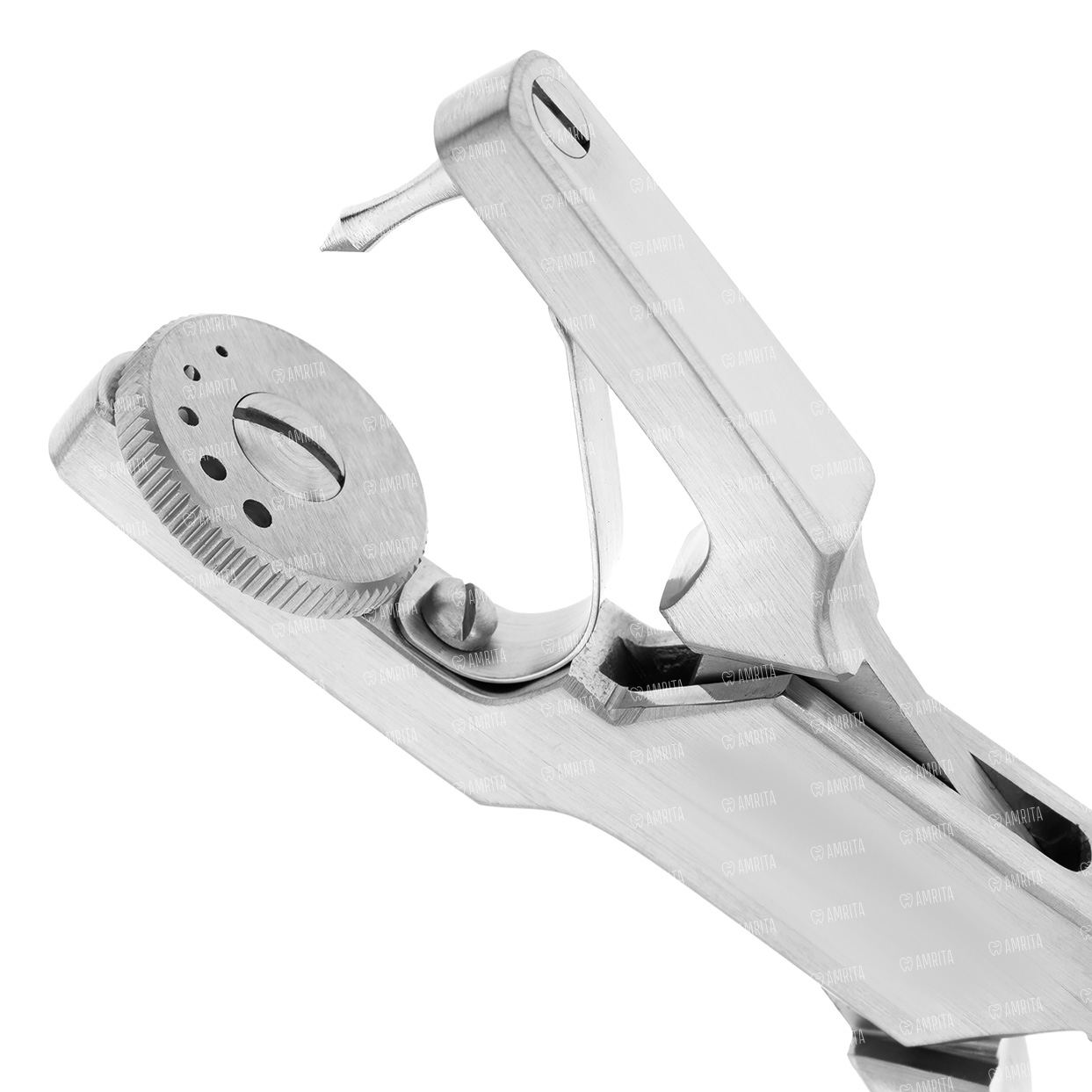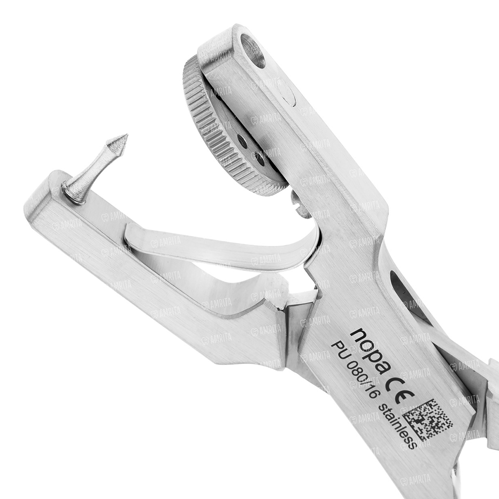 Пробойщик для коффердама используют для создания отверстия в самом коффердаме. На поворотной части расположен диск с 5-ю разными диаметрами: