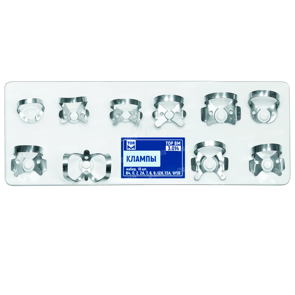 Комплект клампов — состоит из стальных креплений для различных групп зубов. Создает условия для проведения комфортных и безопасных лечебных процедур. Фиксирует стоматологическую латексную завесу. Обеспечение максимальной ретракции без травмирования десны. Клампы (кламмера, фиксирующие зажимы) предназначены для фиксации коффердама, обеспечения надежной изоляции рабочего поля и создания условий для комфортного и безопасного стоматологического лечения. В наборе: кламп В4 — 1 шт., кламп 0 — 1 шт., кламп 2 — 1 шт., кламп 2А — 1 шт., кламп 7 — 1 шт., кламп 8 — 1 шт., кламп 9 — 1 шт., кламп 12А — 1 шт., кламп 13А — 1 шт., кламп W56 — 1шт.