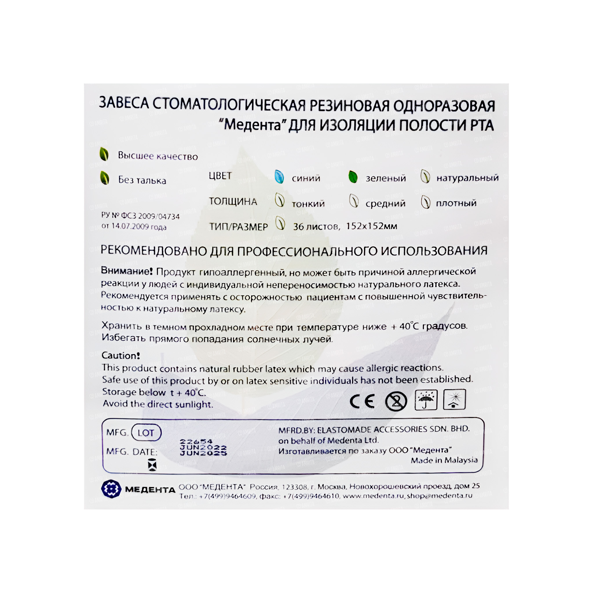 Завеса стоматологическая Medenta Dental Dam, эластичный, для изоляции рабочего поля, тонкая, зеленая, 36 шт