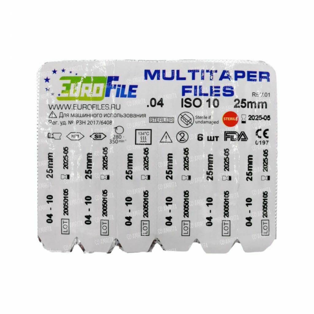 Файлы машинные Eurofile MultiTaper, реципрокный, стерильный, для препарирования каналов, 25 мм (16 мм), №10/.04, никель-титан, 6 шт