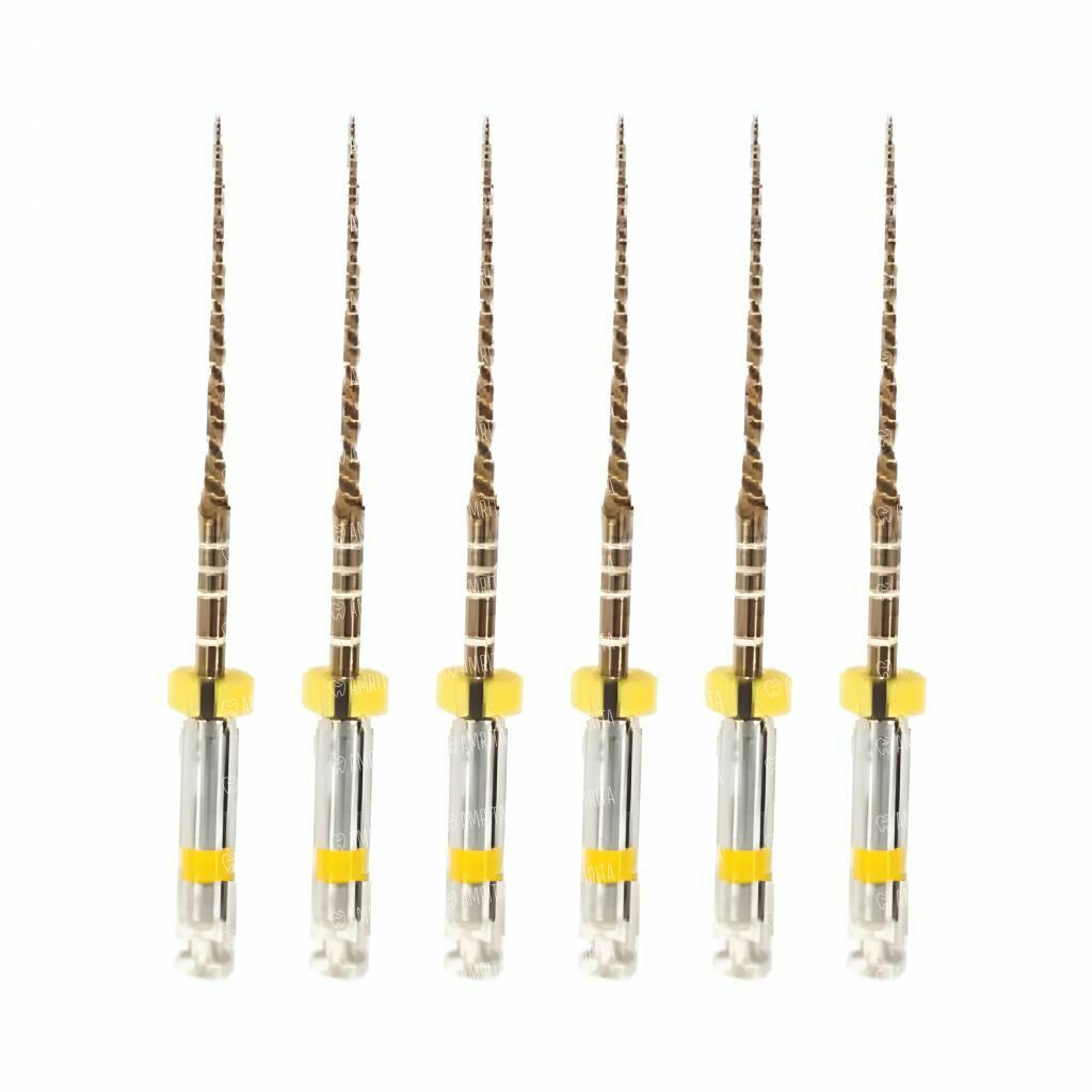 - «Золотая» технология для уникальной гибкости. Специальная температурная обработка придает файлам характерный золотистый цвет и, что более важно, уникальную гибкость и повышенную устойчивость к поломке. Это позволяет безопасно обрабатывать каналы с изгибами до 90 градусов.