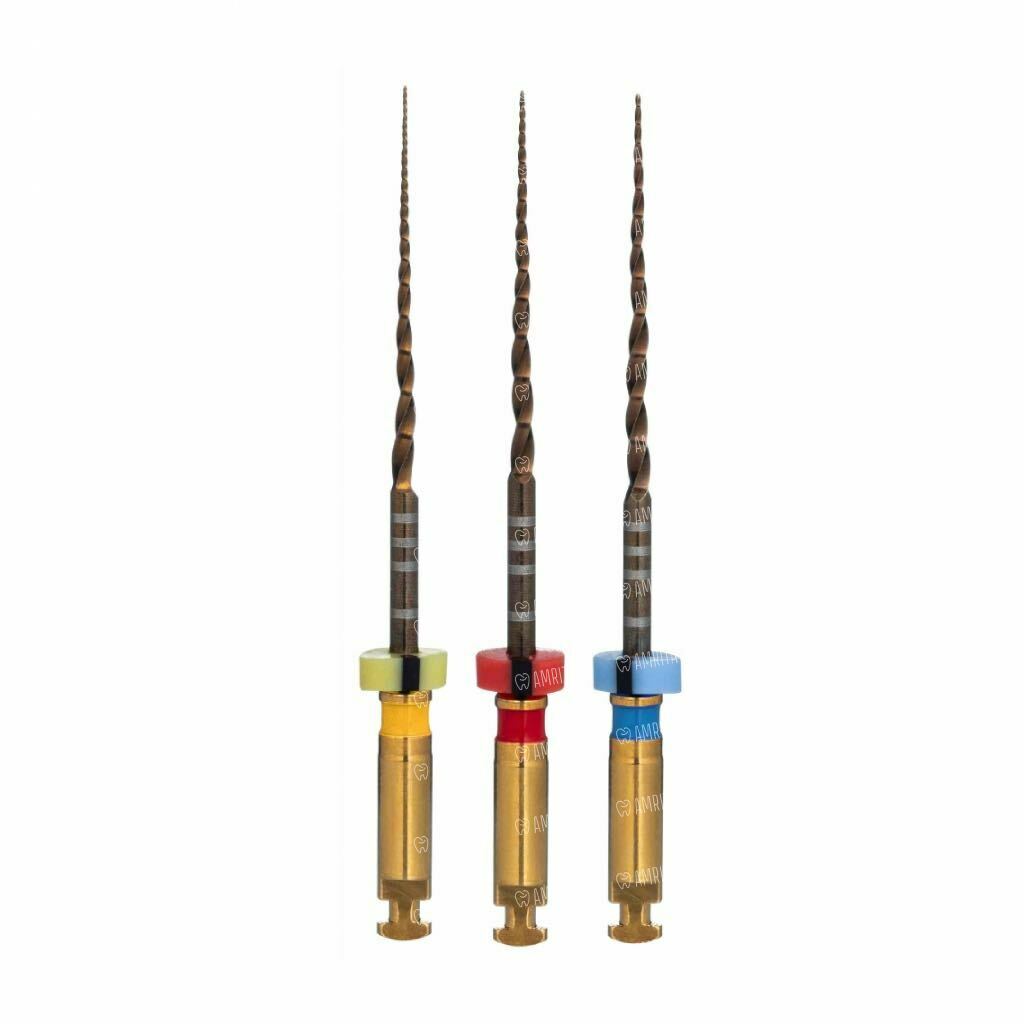 - «Золотой стандарт» гибкости и прочности. Специальная «Gold» термообработка придает файлам повышенную гибкость и устойчивость к циклической усталости. Это позволяет инструменту безопасно проходить даже сложные изгибы, в то время как уникальное сечение увеличивает прочность его сердцевины.