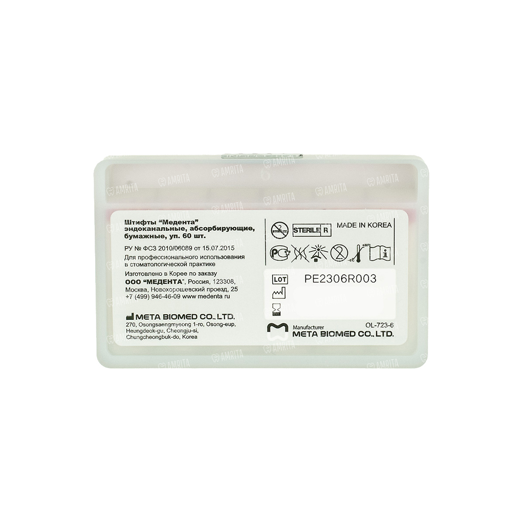 Штифты бумажные Meta Biomed Медента, абсорбирующие, с маркировкой длины, №15-40/.04, 60 шт