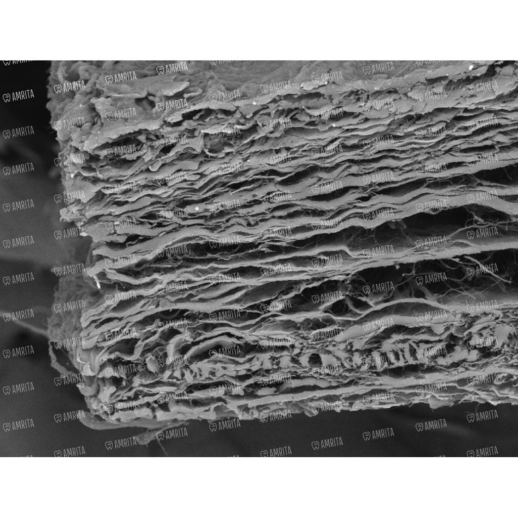 - Двухслойная функциональная структура. Мембрана имеет две разнородные поверхности: плотную и гладкую, которая предотвращает миграцию мягких тканей, и пористую, ворсистую, которая обращена к костному графту для его стабилизации и лучшей интеграции.