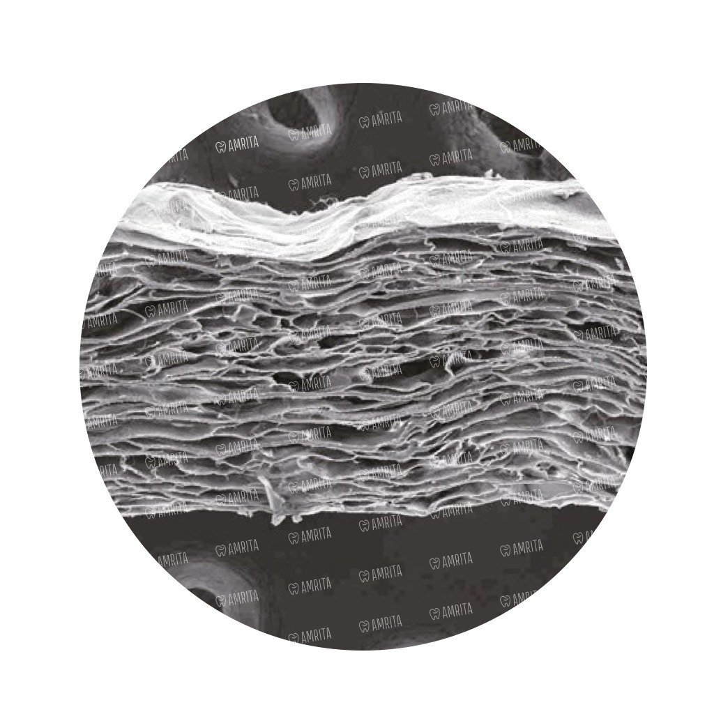 - Двухслойная функциональная структура. Мембрана имеет две разнородные поверхности: гладкую, которая предотвращает миграцию клеток мягких тканей, и шероховатую, которая обращена к костному графту для его стабилизации и лучшей интеграции.