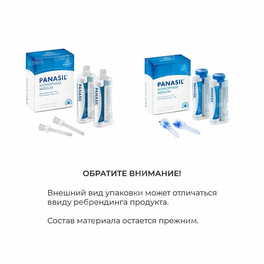 Panasil monophase Medium - среднетекучий, монофазный оттискной материал на основе А-силикона. Великолепные изначальные гидрофильные свойства обеспечивают точность оттиска в экстремальных ситуациях.