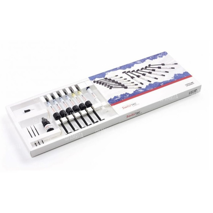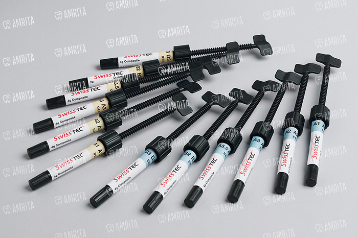 SwissTEC Composite – микрогибридный фотополимерный композитный материал, рентгеноконтрастный, мелкодисперсный, с высоким содержанием неорганического наполнителя. Он, также, может быть отвержден термореактивно вне полости рта под действием галогенного(диодного) света или доведен до нужного состояния в световой/тепловой печи (непрямой метод)