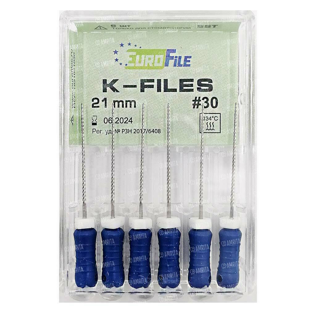 Файлы ручные Eurofile K-Files, для прохождения и расширения корневых каналов, 21 мм, №30/.02, сталь, 6 шт