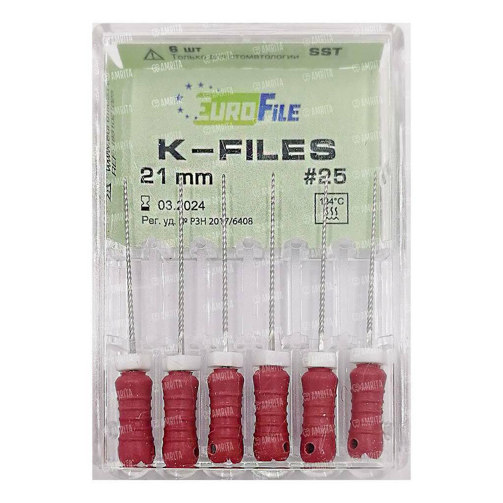 Файлы ручные Eurofile K-Files, для прохождения и расширения корневых каналов, 21 мм, №25/.02, сталь, 6 шт