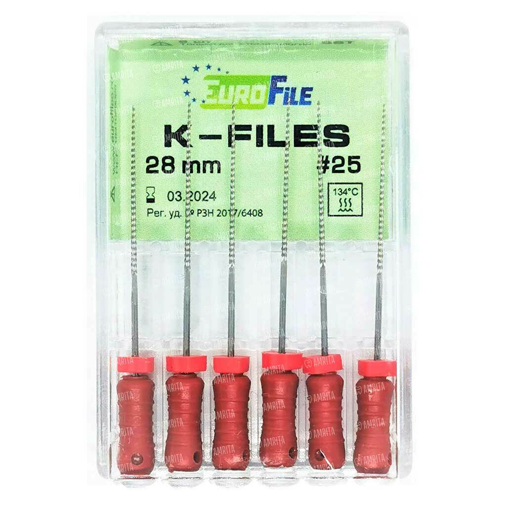 Файлы ручные Eurofile K-Files, для прохождения и расширения корневых каналов, 28 мм, №25/.02, сталь, 6 шт