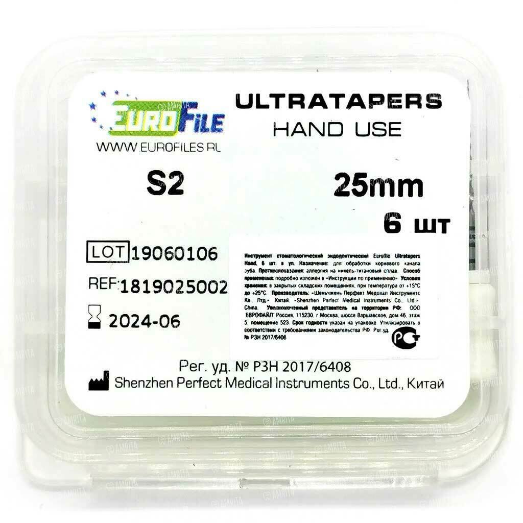 Файлы ручные Eurofile Ultratapers, для обработки корневого канала, 25 мм, №S2, никель-титан, 6 шт