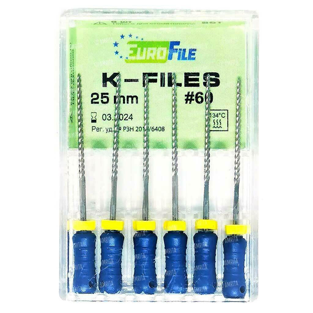 Файлы ручные Eurofile K-Files, для прохождения и расширения корневых каналов, 25 мм, №60/.02, сталь, 6 шт