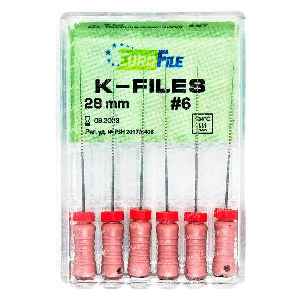 Файлы ручные Eurofile K-Files, для прохождения и расширения корневых каналов, 28 мм, №06/.02, сталь, 6 шт