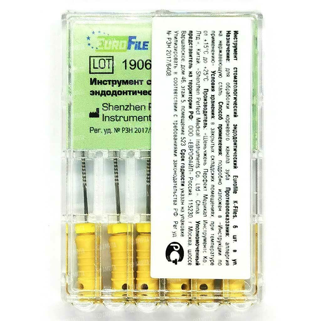 Файлы ручные Eurofile K-Files, для прохождения и расширения корневых каналов, 25 мм, №20/.02, сталь, 6 шт