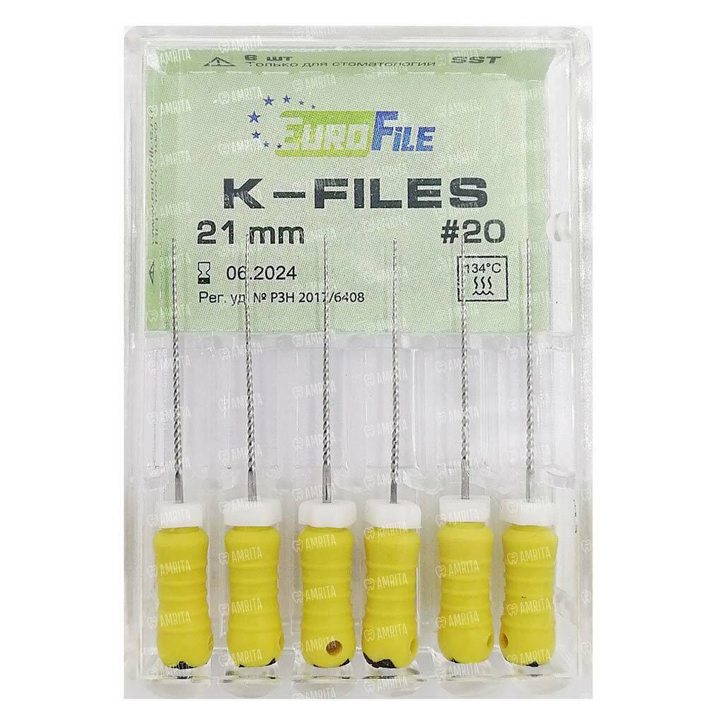 Файлы ручные Eurofile K-Files, для прохождения и расширения корневых каналов, 21 мм, №20/.02, сталь, 6 шт