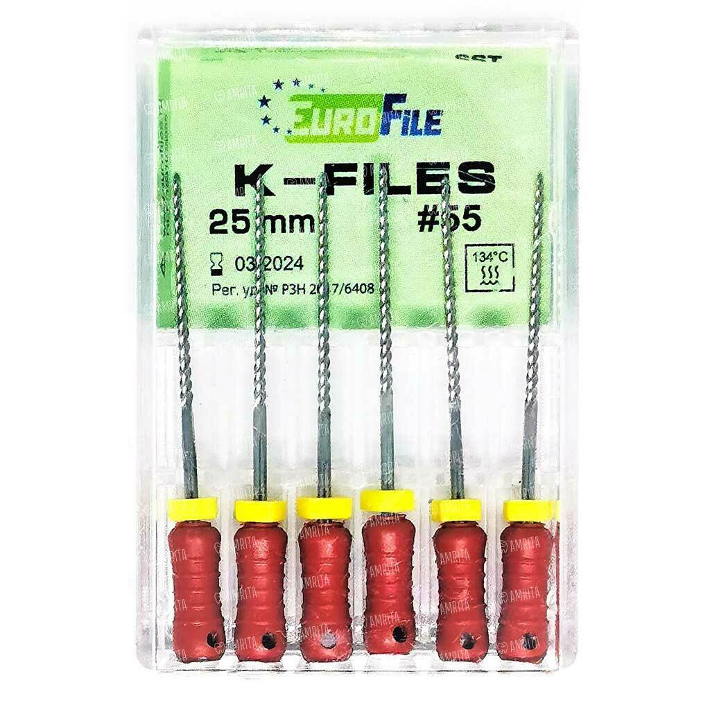 Файлы ручные Eurofile K-Files, для прохождения и расширения корневых каналов, 25 мм, №55/.02, сталь, 6 шт