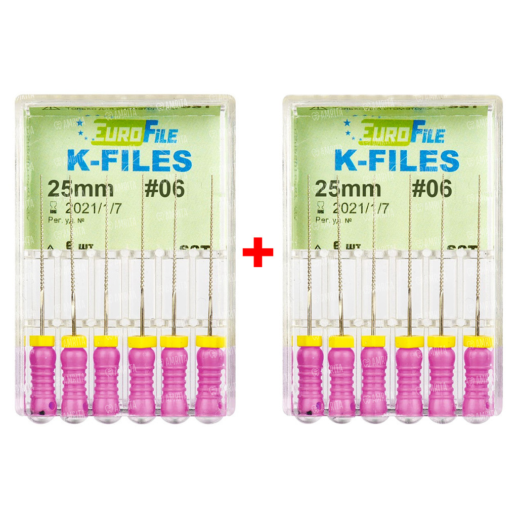 Файлы ручные Eurofile K-Files, для прохождения и расширения корневых каналов, 25 мм, №06/.02, сталь, 6 шт х 2
