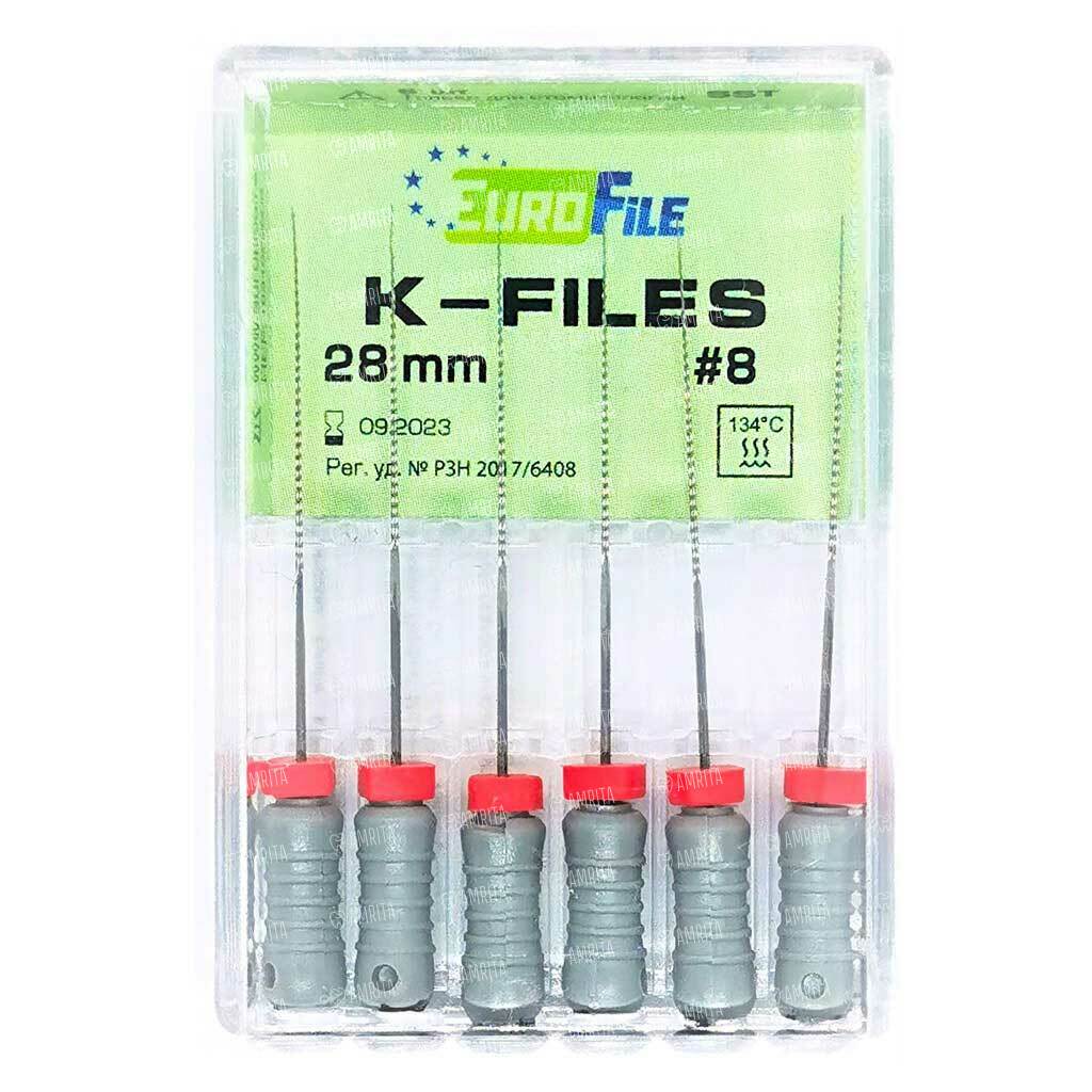 Файлы ручные Eurofile K-Files, для прохождения и расширения корневых каналов, 28 мм, №08/.02, сталь, 6 шт