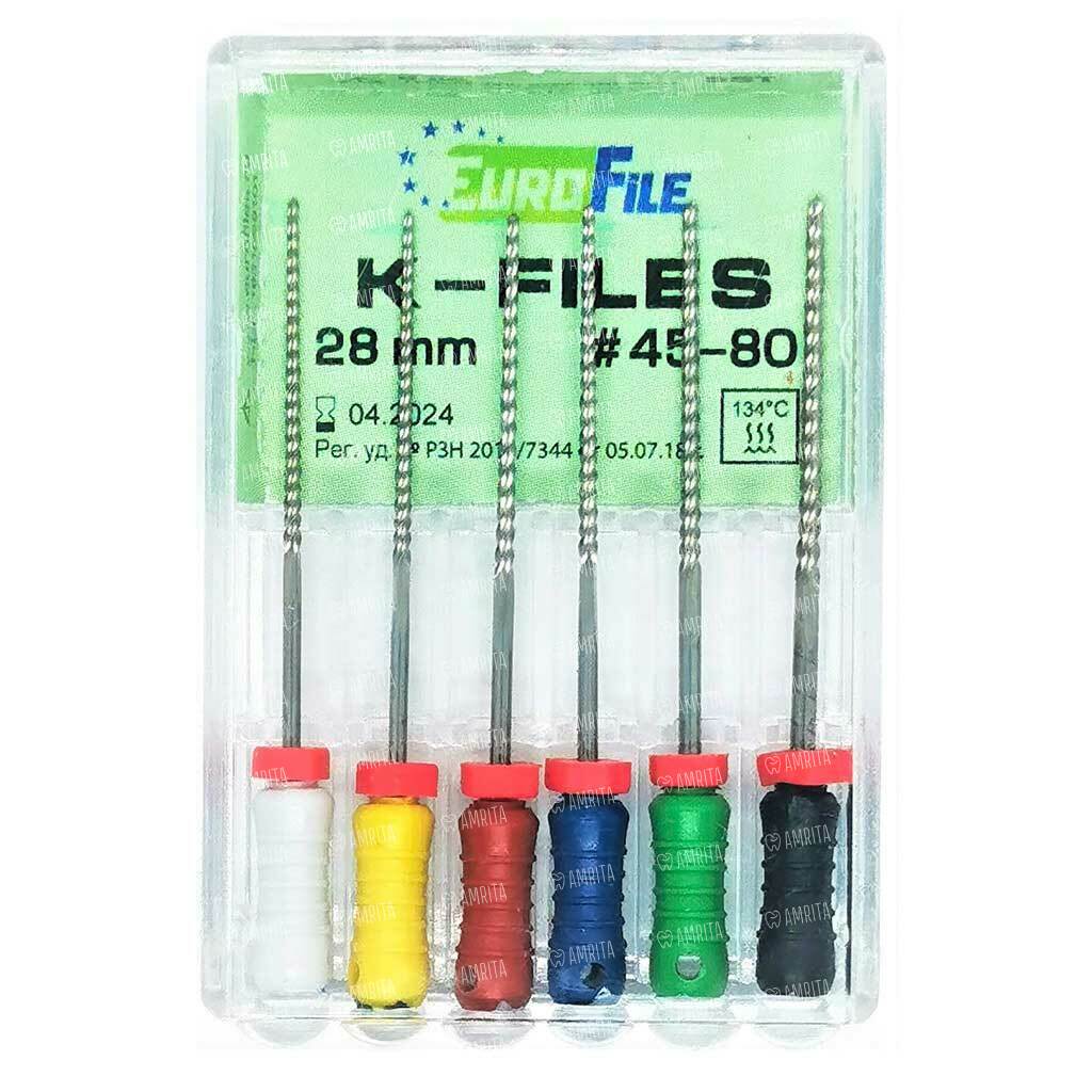 Файлы ручные Eurofile K-Files, для прохождения и расширения корневых каналов, 28 мм, набор №45-80/.02, сталь, 6 шт