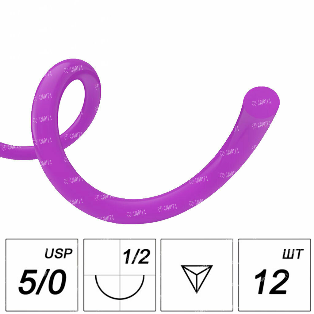 Шовный материал MyDent24 Моноквик, рассасывающаяся мононить, 5/0 75 см, колющая игла 16 мм 1/2, фиолетовый, 12 шт