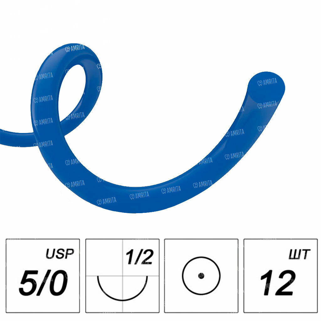 Шовный материал MyDent24 Полипропилен, нерассасывающаяся мононить, 5/0 75 см, колющая игла 16 мм 3/8, синий, 12шт